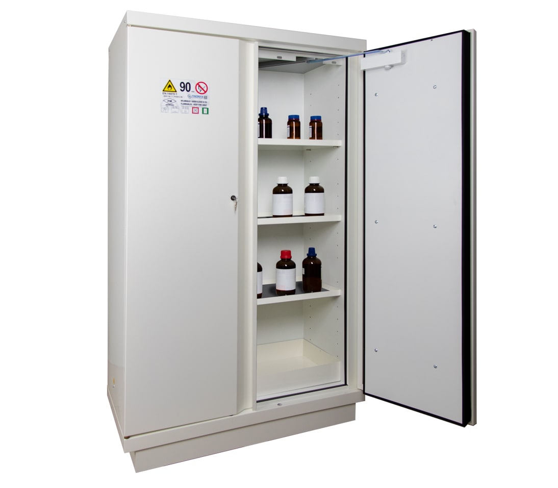 The flammable and/or explosive products have to be stored in safety cabinets. The cabinets EN 14470-1 have a fire resistance allowing protecting the products from a potential fire. We offer 30, 60 or 90 minutes fire resistance ; the 30 and 90 minute ones being also available in multirisks cabinets for the storage of several types of chemicals. On the other hand, the safety cabinets EN 14470-2 have a 30 minute fire resistance and allow protecting gas cylinders in case of a potential fire.